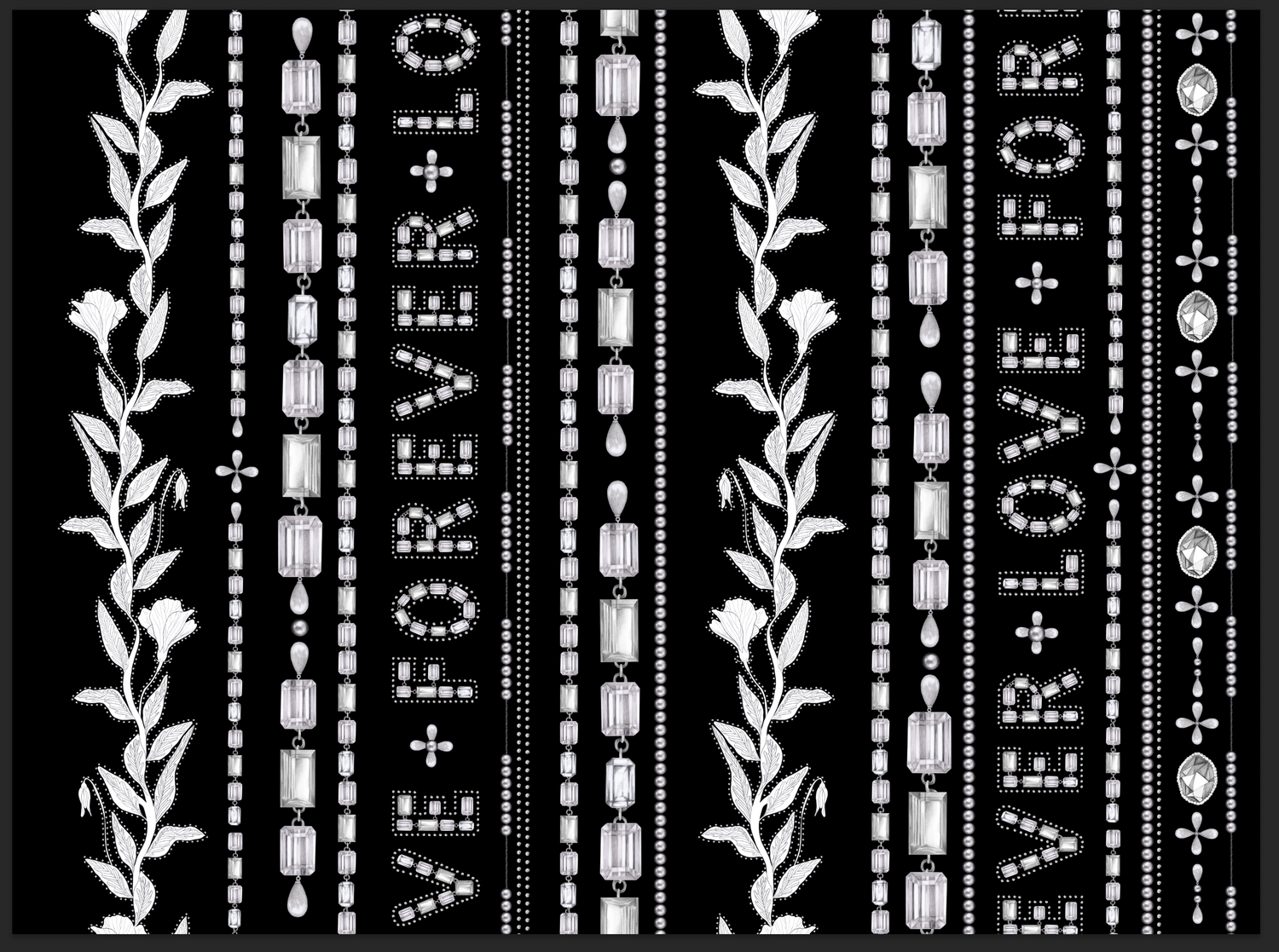 It is set in diamonds, gemstones pearls and strass, so it must be true. The flowers that creep up are inspired by the artform of embroidery. Decorated with the strass that follow the outline.