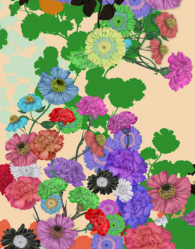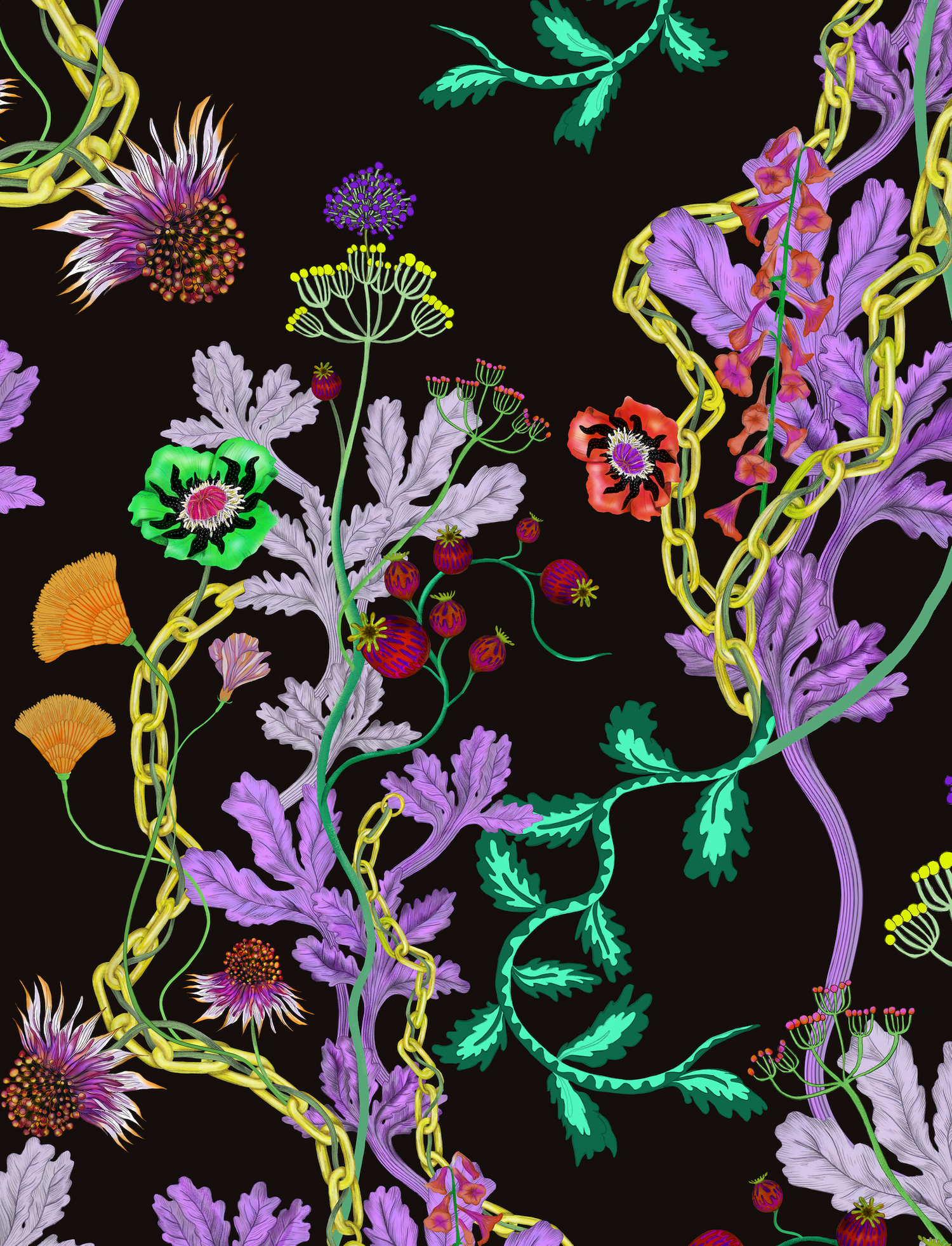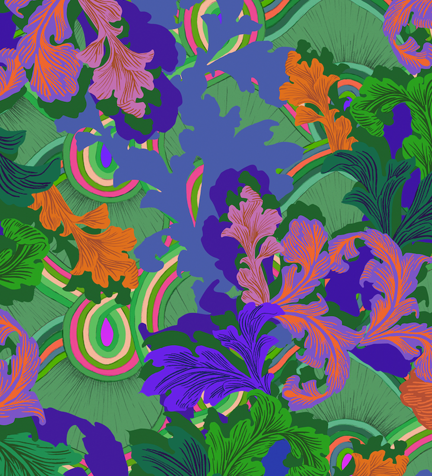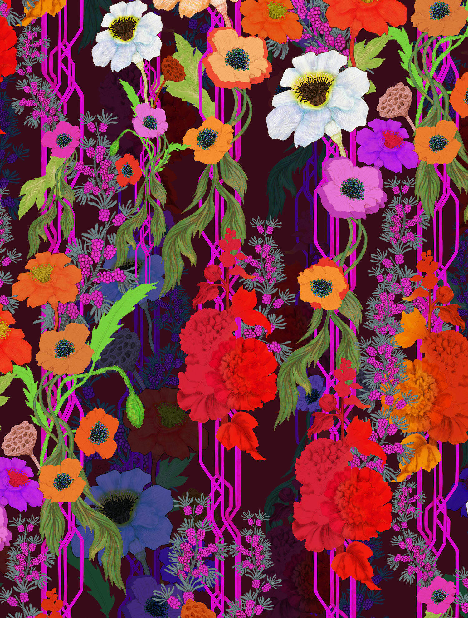 Abundance is key in this print, too much too many, too colourful. Giving joy and colour.