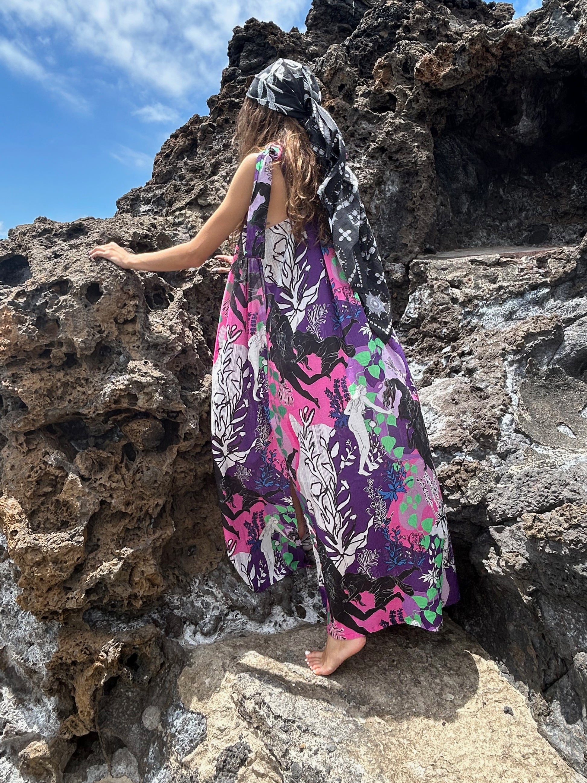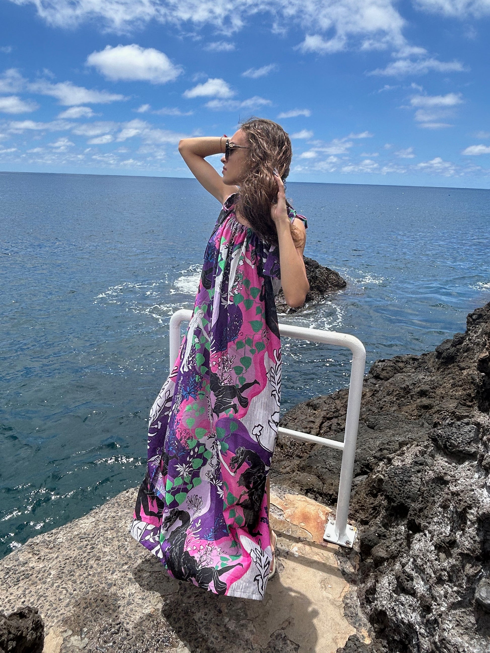 The oversized silhouette dress can easily be worn over a bikini as a cover up, or wear it over your pants. The soft thin cotton is easy to wear and to maintain.