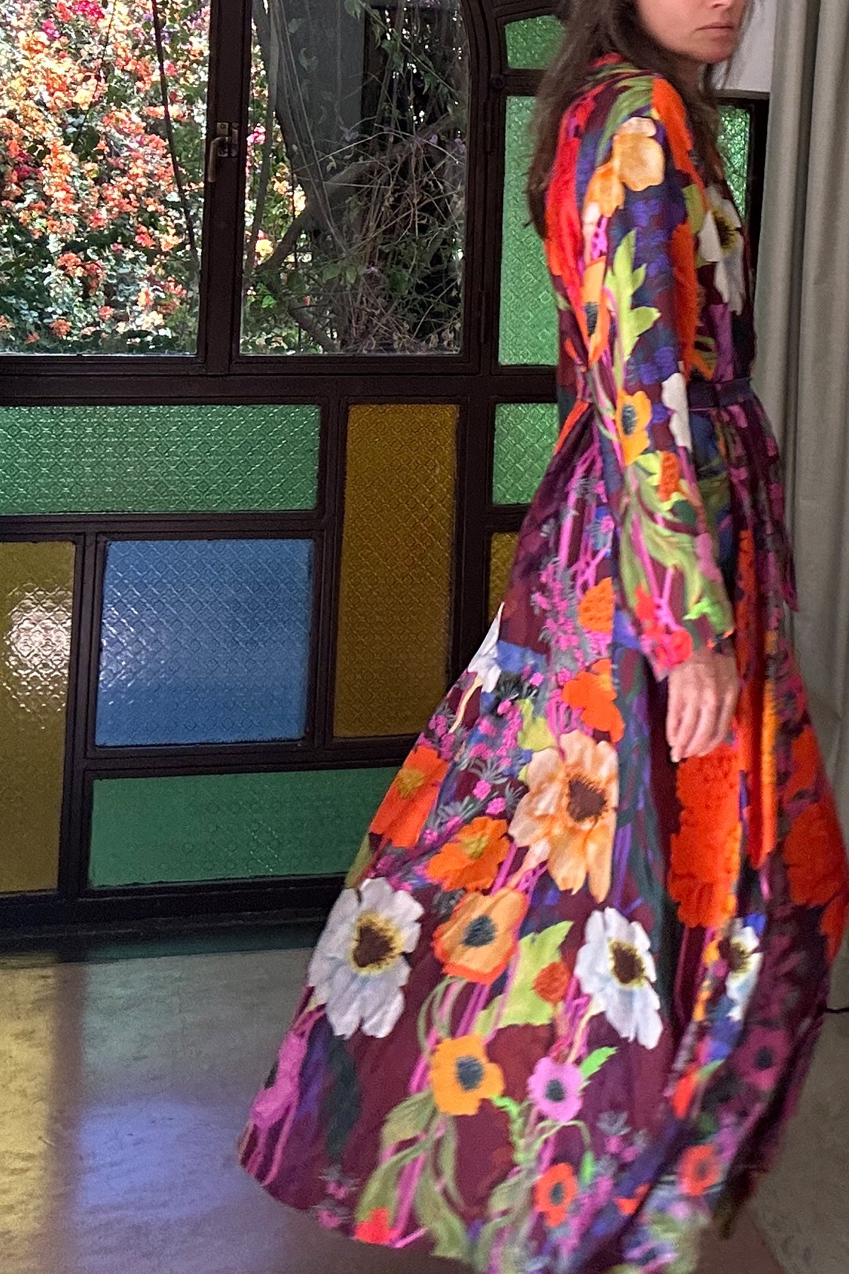 The oversized silhouette robe can be worn like a kimono, closed or open with the large belt / tie. It can also be worn as a wrap dress.